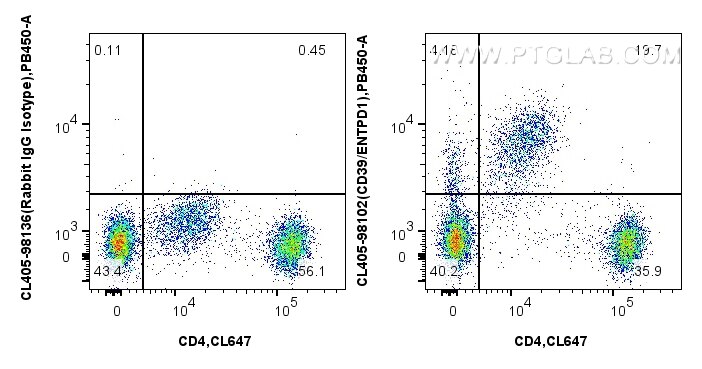 The CD39/ENTPD1 antibody from Proteintech is a rabbit recombinant antibody to a recombinant protein of human CD39/ENTPD1. This antibody recognizes human antigen. The CD39/ENTPD1 antibody has been validated for the following applications: FC analysis. This antibody is coraliteR plus 405.