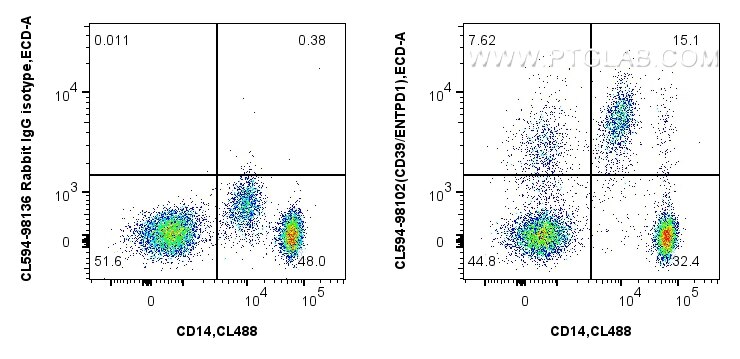 The CD39/ENTPD1 antibody from Proteintech is a rabbit recombinant antibody to a recombinant protein of human CD39/ENTPD1. This antibody recognizes human antigen. The CD39/ENTPD1 antibody has been validated for the following applications: FC analysis. This antibody is coraliteR594.