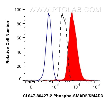 The Phospho-SMAD2 (Ser465/467)/SMAD3 (Ser423/425) antibody from Proteintech is a rabbit recombinant antibody to a peptide of human Phospho-SMAD2 (Ser465/467)/SMAD3 (Ser423/425). This antibody recognizes human antigen. The Phospho-SMAD2 (Ser465/467)/SMAD3 (Ser423/425) antibody has been validated for the following applications: FC (Intra) analysis. This antibody is coraliteR plus 647.