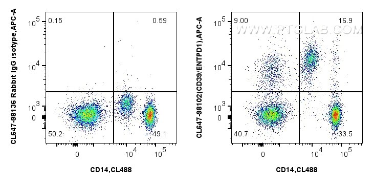 The CD39/ENTPD1 antibody from Proteintech is a rabbit recombinant antibody to a recombinant protein of human CD39/ENTPD1. This antibody recognizes human antigen. The CD39/ENTPD1 antibody has been validated for the following applications: FC analysis. This antibody is coraliteR plus 647.