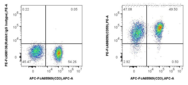 The CD59 antibody from Proteintech is a rabbit recombinant antibody to a recombinant protein of human CD59. This antibody recognizes human antigen. The CD59 antibody has been validated for the following applications: FC analysis. This antibody is pe.