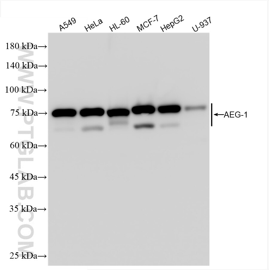 The AEG-1/MTDH antibody from Proteintech is a rabbit recombinant antibody to a recombinant protein of human AEG-1/MTDH. This antibody recognizes human antigen. The AEG-1/MTDH antibody has been validated for the following applications: WB, IF/ICC, FC (Intra), ELISA analysis.