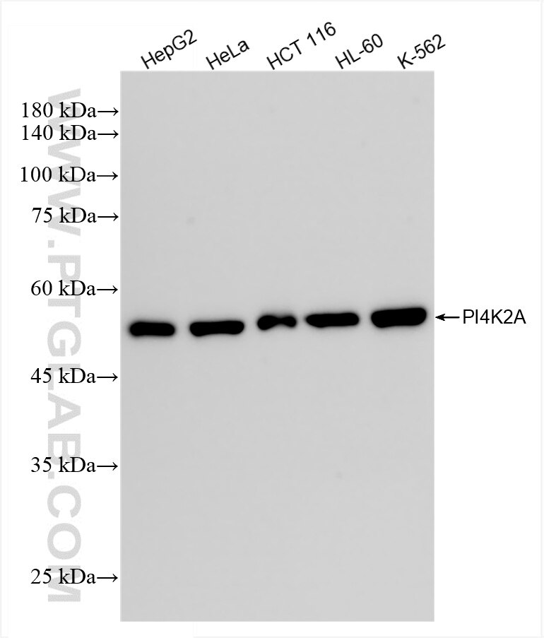 The PI4K2A antibody from Proteintech is a rabbit recombinant antibody to a recombinant protein of human PI4K2A. This antibody recognizes human antigen. The PI4K2A antibody has been validated for the following applications: WB, ELISA analysis.