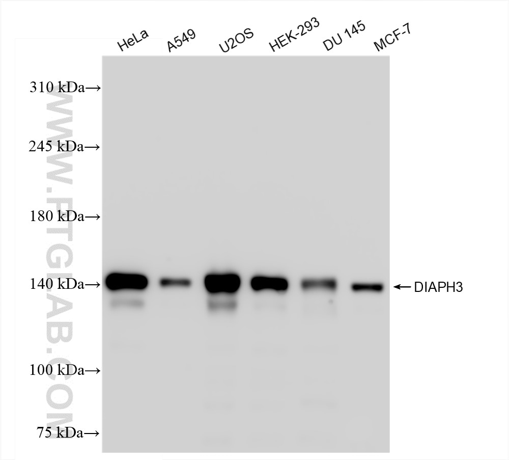 The DIAPH3 antibody from Proteintech is a rabbit recombinant antibody to a recombinant protein of human DIAPH3. This antibody recognizes human antigen. The DIAPH3 antibody has been validated for the following applications: WB, ELISA analysis.