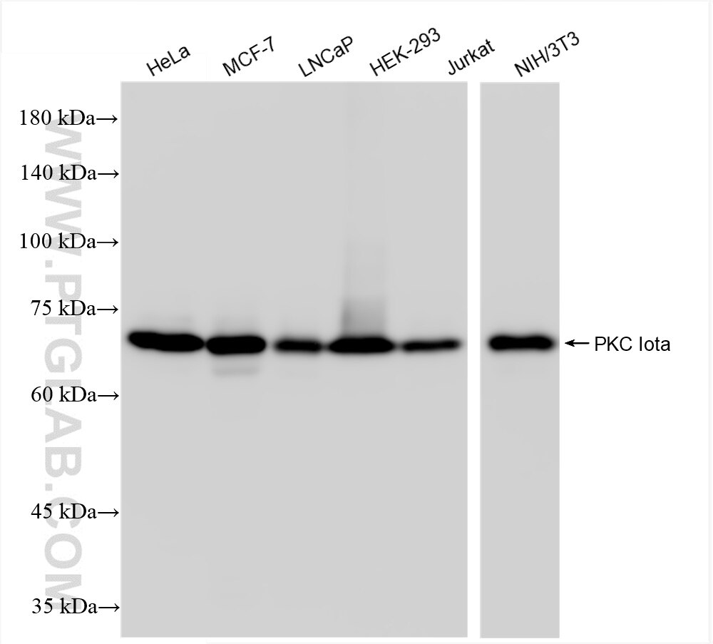 The PKC Iota antibody from Proteintech is a rabbit recombinant antibody to a recombinant protein of human PKC Iota. This antibody recognizes human, mouse, rat antigen. The PKC Iota antibody has been validated for the following applications: WB, ELISA analysis.