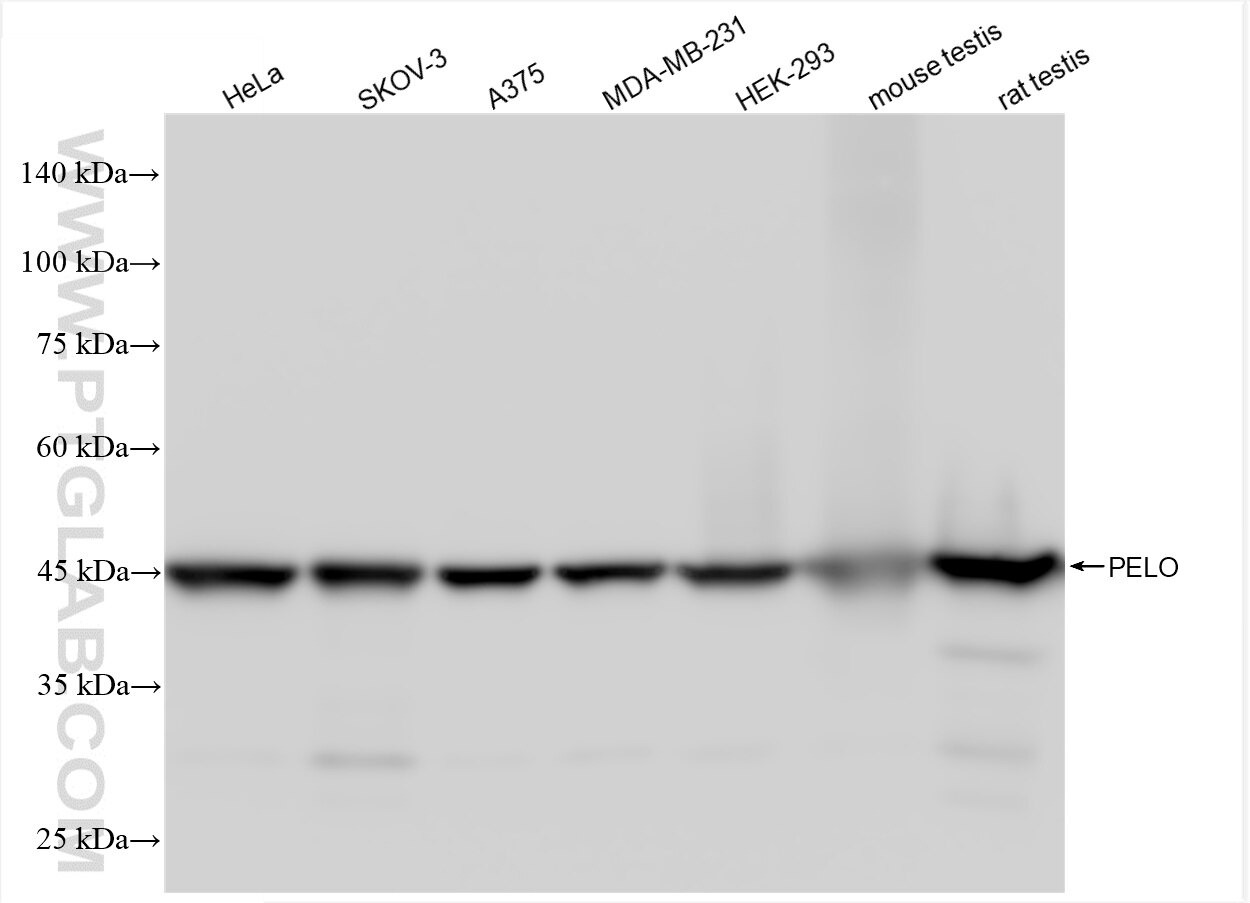 The PELO antibody from Proteintech is a rabbit recombinant antibody to a recombinant protein of human PELO. This antibody recognizes human, mouse, rat antigen. The PELO antibody has been validated for the following applications: WB, ELISA analysis.