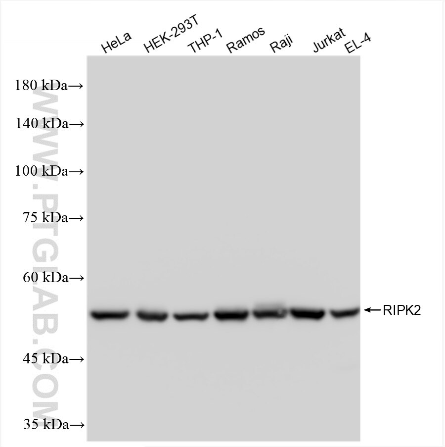 The RIPK2 antibody from Proteintech is a rabbit recombinant antibody to a recombinant protein of human RIPK2. This antibody recognizes human, mouse antigen. The RIPK2 antibody has been validated for the following applications: WB, ELISA analysis.