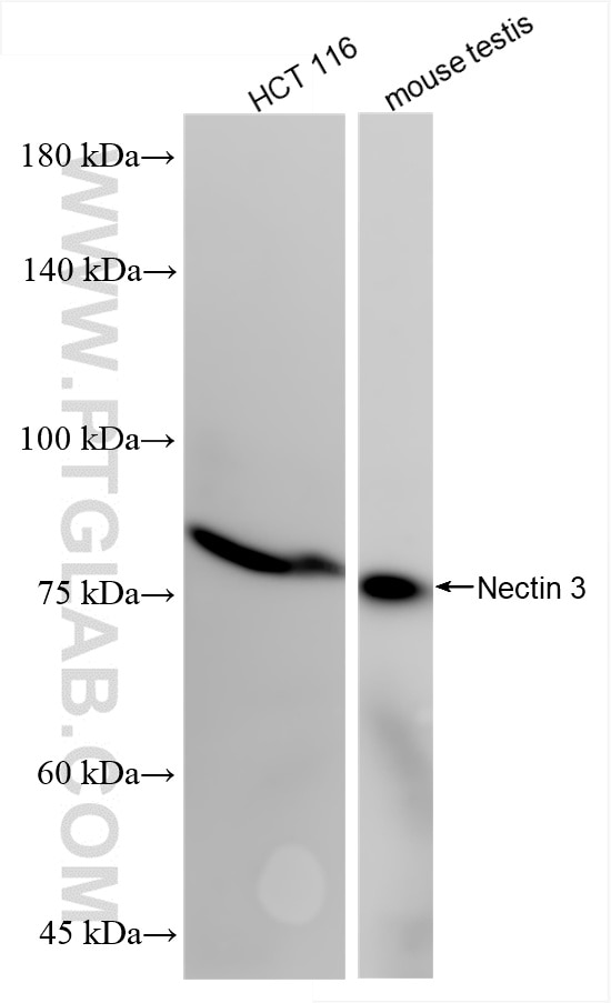The Nectin 3 antibody from Proteintech is a rabbit recombinant antibody to a recombinant protein of human Nectin 3. This antibody recognizes human, mouse antigen. The Nectin 3 antibody has been validated for the following applications: WB, ELISA analysis.