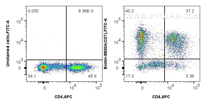 The CD7 antibody from Proteintech is a rabbit recombinant antibody to a recombinant protein of human CD7. This antibody recognizes human antigen. The CD7 antibody has been validated for the following applications: FC analysis. This antibody is biotin.