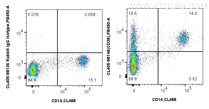 The CD38 antibody from Proteintech is a rabbit recombinant antibody to a recombinant protein of human CD38. This antibody recognizes human antigen. The CD38 antibody has been validated for the following applications: FC analysis. This antibody is coraliteR plus 405.