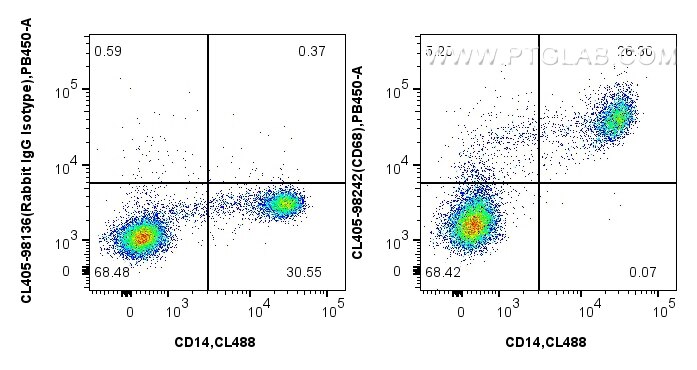 The CD68 antibody from Proteintech is a rabbit recombinant antibody to a recombinant protein of human CD68. This antibody recognizes human antigen. The CD68 antibody has been validated for the following applications: FC (Intra) analysis. This antibody is coraliteR plus 405.