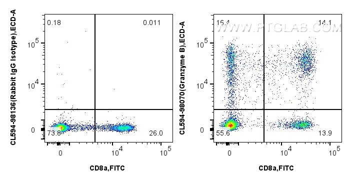 The Granzyme B antibody from Proteintech is a rabbit recombinant antibody to a recombinant protein of human Granzyme B. This antibody recognizes human antigen. The Granzyme B antibody has been validated for the following applications: FC (Intra) analysis. This antibody is coraliteR594.