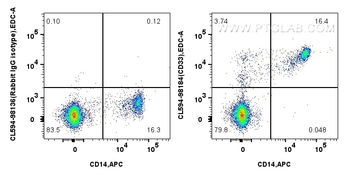 The CD33 antibody from Proteintech is a rabbit recombinant antibody to a recombinant protein of human CD33. This antibody recognizes human antigen. The CD33 antibody has been validated for the following applications: FC analysis. This antibody is coraliteR594.