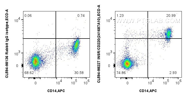 The INSR/CD220 antibody from Proteintech is a rabbit recombinant antibody to a recombinant protein of human INSR/CD220. This antibody recognizes human antigen. The INSR/CD220 antibody has been validated for the following applications: FC analysis. This antibody is coraliteR594.
