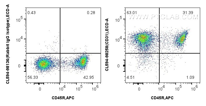 The CD31 antibody from Proteintech is a rabbit recombinant antibody to a recombinant protein of mouse CD31. This antibody recognizes mouse antigen. The CD31 antibody has been validated for the following applications: FC analysis. This antibody is coraliteR594.