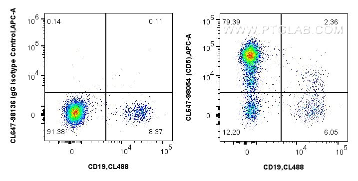 The CD5 antibody from Proteintech is a rabbit recombinant antibody to a recombinant protein of human CD5. This antibody recognizes human antigen. The CD5 antibody has been validated for the following applications: FC analysis. This antibody is coraliteR plus 647.