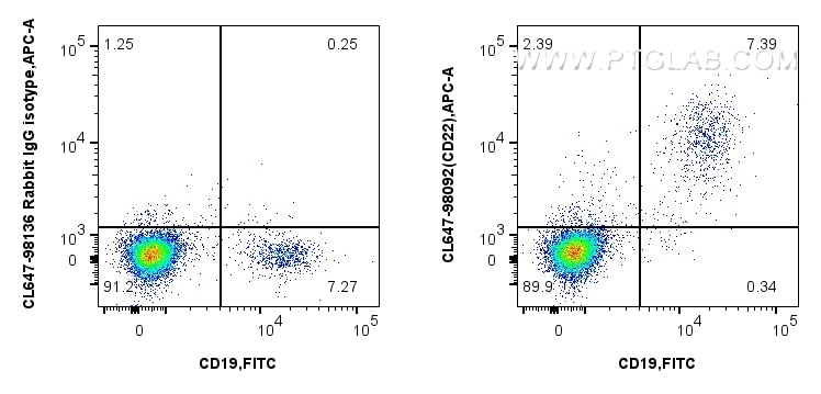The CD22 antibody from Proteintech is a rabbit recombinant antibody to a recombinant protein of human CD22. This antibody recognizes human antigen. The CD22 antibody has been validated for the following applications: FC analysis. This antibody is coraliteR plus 647.