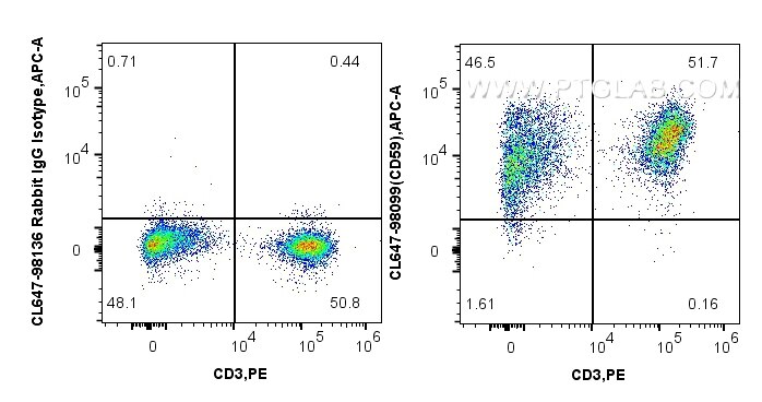 The CD59 antibody from Proteintech is a rabbit recombinant antibody to a recombinant protein of human CD59. This antibody recognizes human antigen. The CD59 antibody has been validated for the following applications: FC analysis. This antibody is coraliteR plus 647.