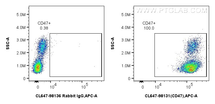 The CD47 antibody from Proteintech is a rabbit recombinant antibody to a recombinant protein of human CD47. This antibody recognizes human antigen. The CD47 antibody has been validated for the following applications: FC analysis. This antibody is coraliteR plus 647.