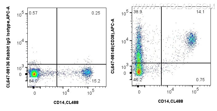 The CD38 antibody from Proteintech is a rabbit recombinant antibody to a recombinant protein of human CD38. This antibody recognizes human antigen. The CD38 antibody has been validated for the following applications: FC analysis. This antibody is coraliteR plus 647.