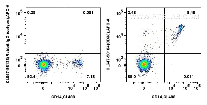 The CD33 antibody from Proteintech is a rabbit recombinant antibody to a recombinant protein of human CD33. This antibody recognizes human antigen. The CD33 antibody has been validated for the following applications: FC analysis. This antibody is coraliteR plus 647.