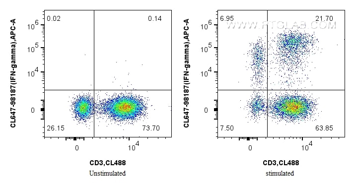 The IFN-gamma antibody from Proteintech is a rabbit recombinant antibody to a recombinant protein of human IFN-gamma. This antibody recognizes human antigen. The IFN-gamma antibody has been validated for the following applications: FC (Intra) analysis. This antibody is coraliteR plus 647.