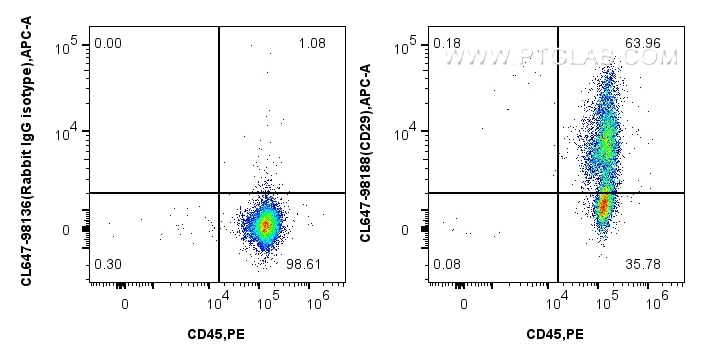 The CD29 antibody from Proteintech is a rabbit recombinant antibody to a recombinant protein of human CD29. This antibody recognizes human antigen. The CD29 antibody has been validated for the following applications: FC analysis. This antibody is coraliteR plus 647.
