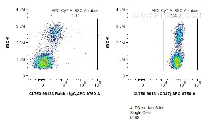 The CD47 antibody from Proteintech is a rabbit recombinant antibody to a recombinant protein of human CD47. This antibody recognizes human antigen. The CD47 antibody has been validated for the following applications: FC analysis. This antibody is coraliteR plus 750.