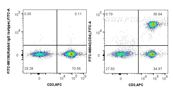 The CD4 antibody from Proteintech is a rabbit recombinant antibody to a recombinant protein of human CD4. This antibody recognizes human antigen. The CD4 antibody has been validated for the following applications: FC analysis. This antibody is fitc plus.