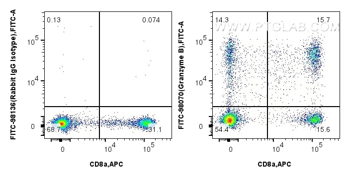 The Granzyme B antibody from Proteintech is a rabbit recombinant antibody to a recombinant protein of human Granzyme B. This antibody recognizes human antigen. The Granzyme B antibody has been validated for the following applications: FC (Intra) analysis. This antibody is fitc plus.