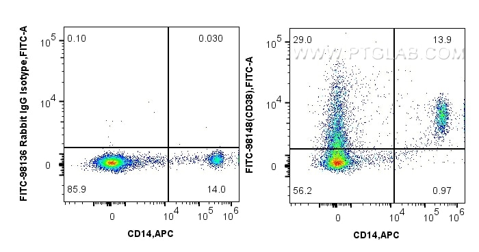 The CD38 antibody from Proteintech is a rabbit recombinant antibody to a recombinant protein of human CD38. This antibody recognizes human antigen. The CD38 antibody has been validated for the following applications: FC analysis. This antibody is fitc plus.