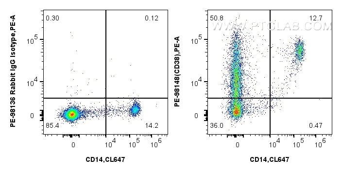 The CD38 antibody from Proteintech is a rabbit recombinant antibody to a recombinant protein of human CD38. This antibody recognizes human antigen. The CD38 antibody has been validated for the following applications: FC analysis. This antibody is pe.