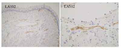 LA102 reacts with mouse lymphatic vessels except the thoracic duct and the marginal sinus of lymph nodes, but not with any blood vessels. LA102 recognized a protein of around 26 kDa. The antigen recognized by LA102 was localized on both luminal and abluminal lymphatic endothelial cell membranes. Besides lymphatics, some lymphoid cells are also recognized.