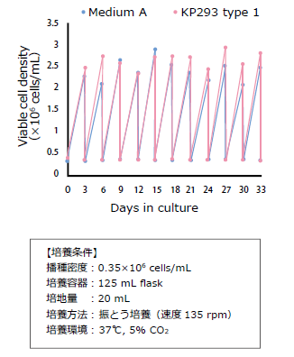 FreeStyle 293-F細胞を本培地にアダプテーションさせた後、細胞増殖を評価した。表記の条件で、本培地(KP293 type 1)および市販培地(Medium A)で培養した。培養3 ??には2×106 cells/mL 以上の細胞増殖が認められ、10 継代安定して培養できた。