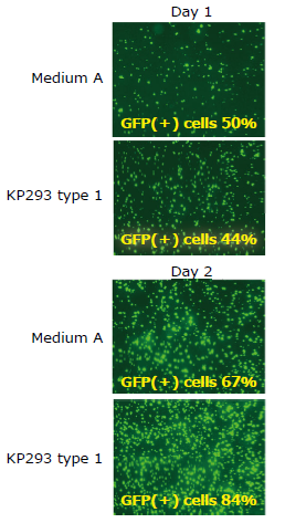 FreeStyle 293-F細胞を本培地にアダプテーションさせた後、トランスフェクション効率(GFP陽性率)を評価した。PEI MAX?(Polysciences, Inc.)を用いて、GFP Plasmid をトランスフェクションし、GFP の陽性細胞数はフローサイトメーターで測定した。トランスフェクション後1日目及び2日目の蛍光画像を示す。本培地は、市販培地と同程度のGFP陽性細胞率が認められた。