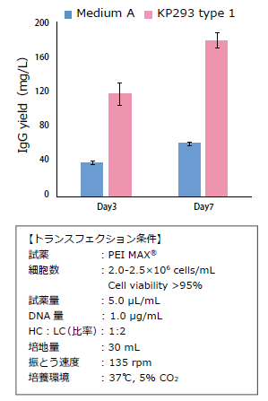 FreeStyle 293-F細胞を本培地にアダプテーションさせた後、Rabbit IgG(whole molecule)発現量を評価した。表記の条件で、トランスフェクションを行い、培養3日目および7日目のIgG の発現量をOctet?システム(Protein A)で測定した。本培地を用いた場合、市販培地に対して約3 倍のIgG 発現が認められた。