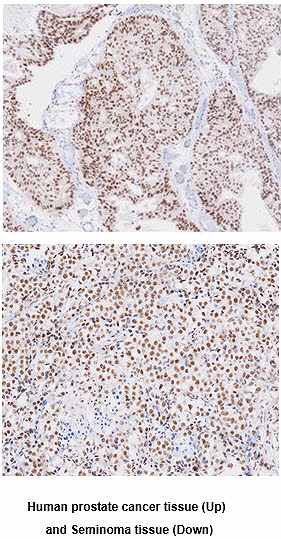 Paraffin embedded sections of human prostate cancer and seminoma tissue were incubated with anti-human TARDBP(1:50) for 2 hours at room temperature. Antigen retrieval was performed in 0.1M sodium citrate buffer and detected using Diaminobenzidine (DAB)