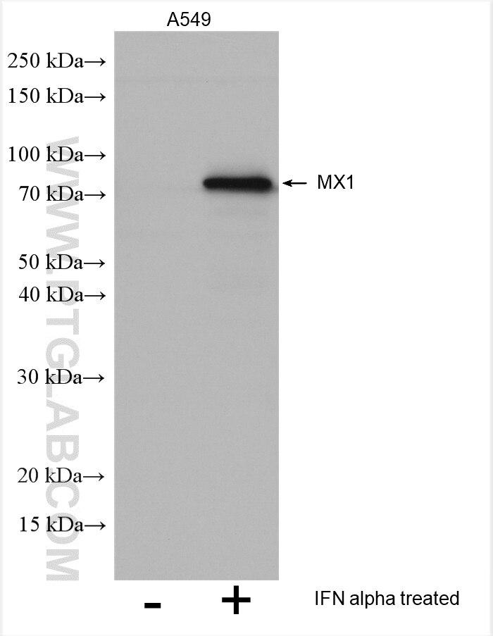 The MX1 antibody from Proteintech is a rabbit polyclonal antibody to a recombinant protein of human MX1. This antibody recognizes human, mouse antigen. The MX1 antibody has been validated for the following applications: WB, IHC, IF/ICC, FC (Intra), IP, ELISA analysis.