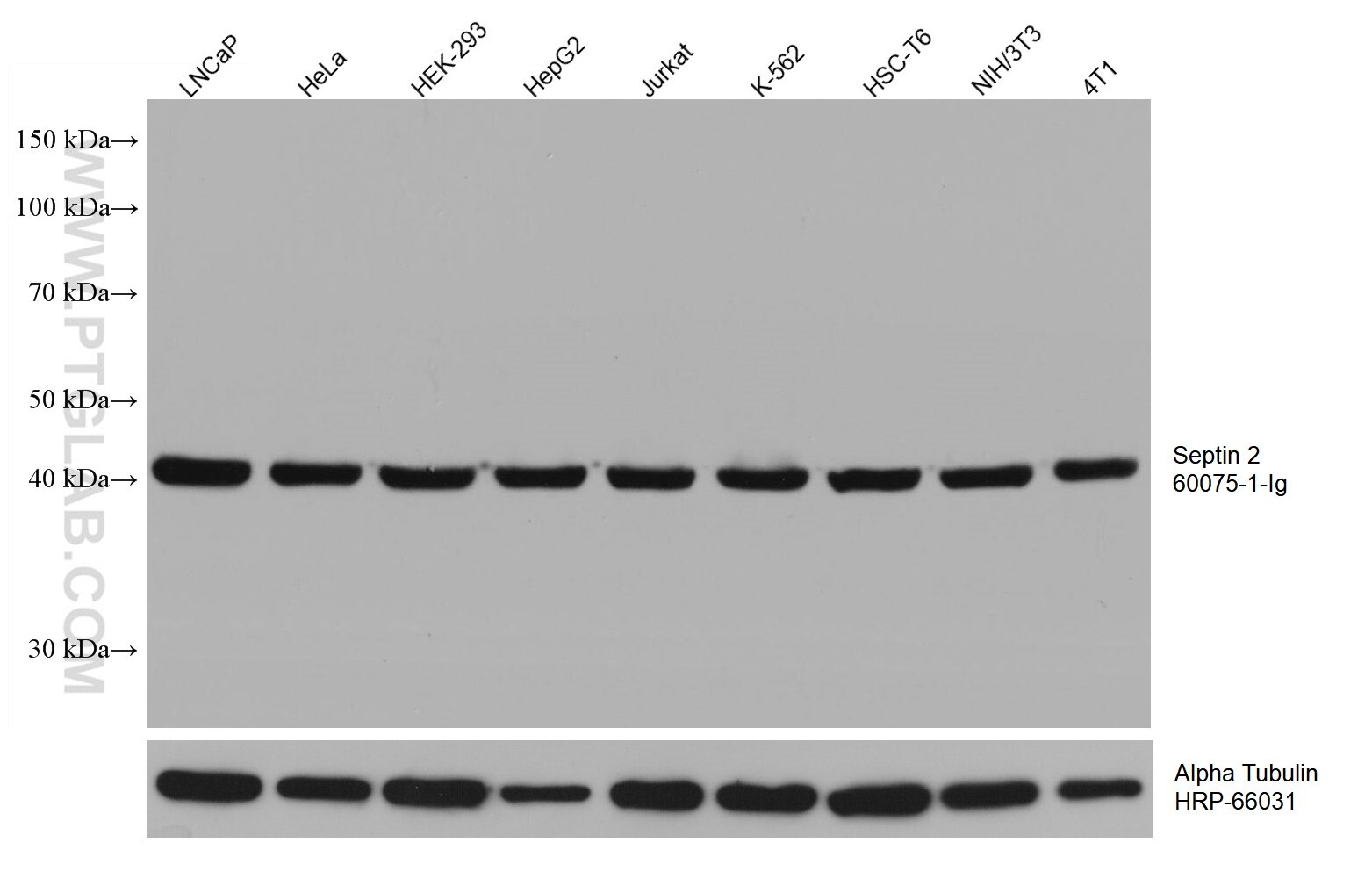 The Septin 2 antibody from Proteintech is a mouse monoclonal antibody to a recombinant protein of human Septin 2. This antibody recognizes human, mouse, rat antigen. The Septin 2 antibody has been validated for the following applications: WB, IHC, IF/ICC, FC (Intra), ELISA analysis.
