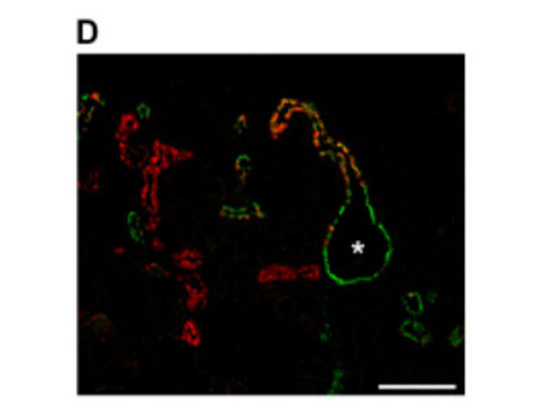 Double-immunofluorescence staining for aquaporin-2 (green) and calbindin (a marker of connecting tubules, red) demonstrates the sudden transition from a calbindin-positive connecting tubule to an aquaporin-2-positive collecting duct cyst (asterisk in D). Scale bars: 100?μm.? Fig. 7. PMID: 34345895.