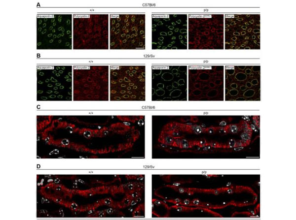 Intrarenal distribution of polycystin-2poreL1?in homozygous?Pkd2poreL1?knock-in mice.?(A,B) Immunofluorescence staining for aquaporin-2 as a marker for collecting ducts on the one hand and for polycystin-2 and polycystin-2poreL1?on the other hand in 6-month-old wild-type (+/+) and homozygous?Pkd2poreL1?knock-in (p/p) female mice demonstrates the presence of wild-type polycystin-2 and of polycystin-2poreL1?in papillary collecting ducts in both the C57Bl/6 and 129/Sv genetic backgrounds. Note the larger diameter of collecting ducts in the?Pkd2poreL1/poreL1?mice. Scale bar: 50?μm. (C,D) Immunofluorescence staining of kidney sections from 6-month-old wild-type (+/+) and homozygous?Pkd2poreL1?knock-in (p/p) mice. Both in the C57Bl/6 and in the 129/Sv background, identical distributions of the wild-type and mutant polycystin-2 proteins (red signal) are seen. Nuclei are shown in white. Images are representative of three experiments. Scale bars: 10?μm. Fig. 5. PMID: 34345895.