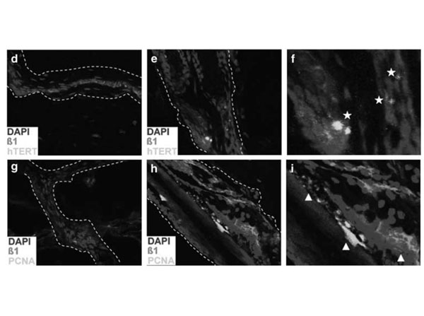 Immunofluorescence results using Donkey Anti-Rabbit IgG DyLight?405. After application of hTERT?DNA?PEI complex, hTERT protein expression promoted proliferation of hair follicle stem cells and enhanced hair growth. Immunofluorescent staining of hTERT and PCNA in dorsal skin treated with DNA?PEI complex (f, stars; i, triangles) at day 40 after wounding compared with non-treated control (d, g), respectively. (f, i) Displayed higher magnification micrographs of (e) and (h), respectively. Figure 6. PMID: 21593794.
