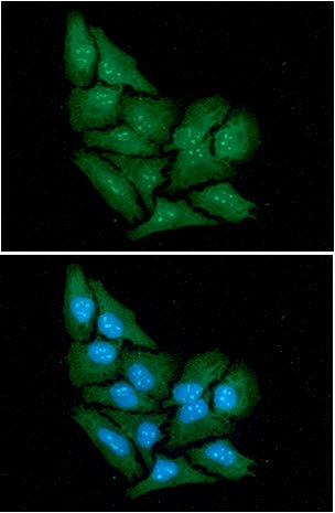 ICC/IF analysis of CD44 in HeLa cells. The cell was stained with ACD0826 (1:100). The secondary antibody (green) was used Alexa Fluor 488. DAPI was stained the cell nucleus (blue).