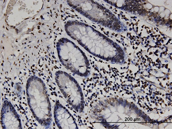 Immunoperoxidase of monoclonal antibody to RABGAP1L on formalin-fixed paraffin-embedded human small Intestine. [antibody concentration 3 ug/ml]
