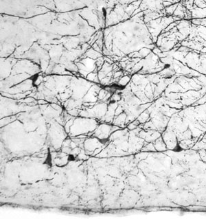 Tyrosine Hydroxylase (TYH) TH-positive neurons (red) in the substantia nigra of a GFP-expressing transgenic mouse.
