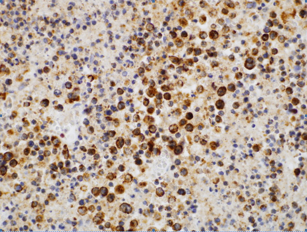 Formalin-fixed and paraffin-embedded human lymph node tissue (4 μm) corresponding to EBV infectious mononucleosis (B) stained with anti-EBV-LMP-1 (DB 061) antibody.