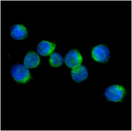 ICC/IF analysis of IL32 in Jurkat cells line, stained with DAPI (Blue) for nucleus staining and monoclonal anti-human IL32 antibody (1:100) with goat anti-mouse IgG-Alexa fluor 488 conjugate (Green).