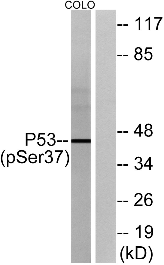 Western blot analysis of lysates from COLO cells, using p53 (Phospho-Ser37) Antibody. The lane on the right is blocked with the phospho peptide.