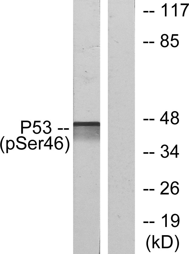 Western blot analysis of lysates from 293 cells treated with UV, using p53 (Phospho-Ser46) Antibody. The lane on the right is blocked with the phospho peptide.
