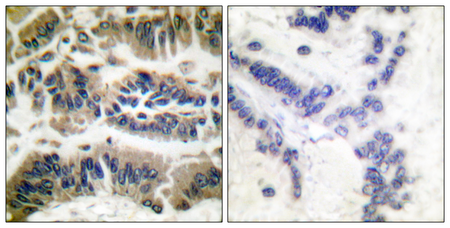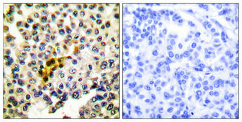 Immunohistochemical analysis of paraffin-embedded Human breast cancer. Antibody was diluted at 1:100(4° overnight). High-pressure and temperature Tris-EDTA,pH8.0 was used for antigen retrieval. Negetive contrl (right) obtaned from antibody was pre-absorbed by immunogen peptide.